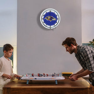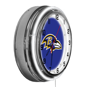 Make Your Fan Room Glow With Your 18" Baltimore Ravens Neon Clock. Inner Band Of Neon Is White To Brighten The Face Of The Clock And Outer Band Focuses On Your Favorite Teams Color. Be The Envy Of All All Your Friends When They Come Over To Watch The Big Game