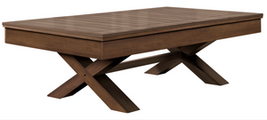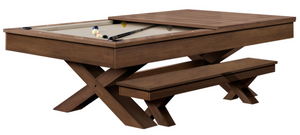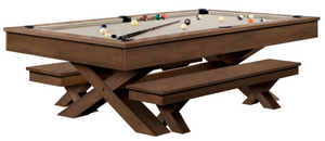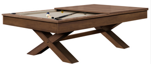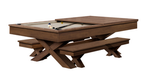 Bold and pleasing to the eye, Blake's modern lines will blend in with any room décor. Handcrafted of birch, acacia, and engineered wood with a rich whiskey finish, the table boasts custom leather drop pockets and a superior play surface of slate and stain-resistant cloth. Your games will be enhanced by the decorative but functional metal rail sights that add just the right touch of elegance. The Blake Pool Table Dining Table will make a solid statement to your home as a 2 in 1 dining pool table set.