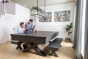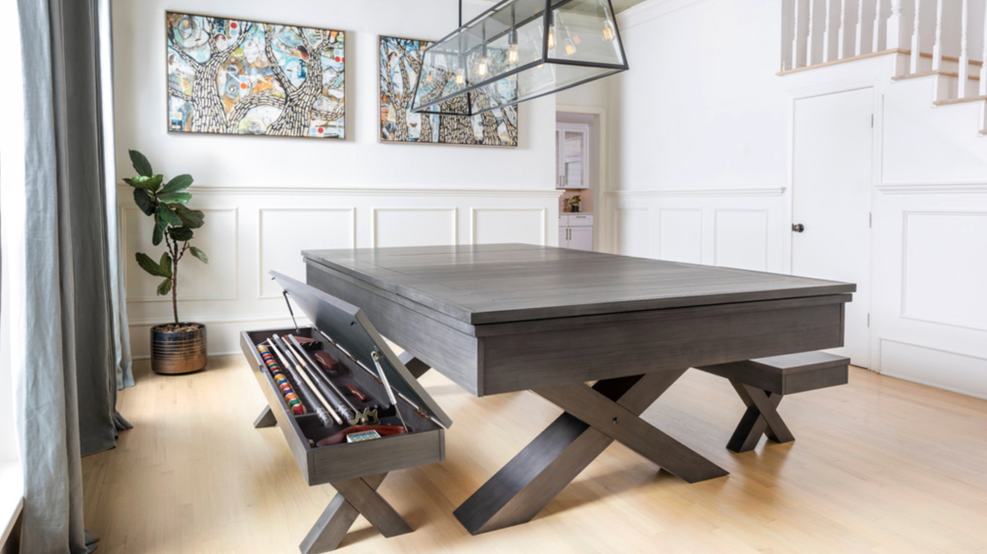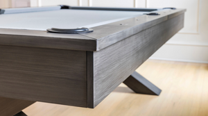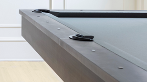 Bold and pleasing to the eye, the Blake’s modern lines will blend in with any room décor. Handcrafted of pine, acacia, and engineered wood with an eye-catching Kona finish, the table boasts custom leather drop pockets and a superior play surface of slate and stain-resistant cloth. Your games will be enhanced by the decorative but functional metal rail sights that add just the right touch of elegance. The Blake will make a solid statement to your home.