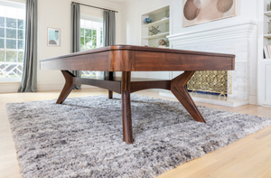 This Solid Walnut pool table features elements of mid-century modern design with completely original features. Boomerang legs, rounded corners and a shelf under the playfield make this table gorgeous and functional. The shelf sits directly under the playfield and is a great place to store game accessories. All Imperial pool tables are skillfully crafted and designed by billiard experts and enthusiasts.