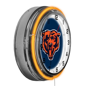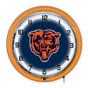 Make Your Fan Room Glow With Your 18" Chicago Bears Neon Clock. Inner Band Of Neon Is White To Brighten The Face Of The Clock And Outer Band Focuses On Your Favorite Teams Color. Be The Envy Of All All Your Friends When They Come Over To Watch The Big Game