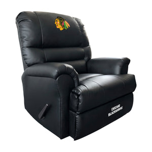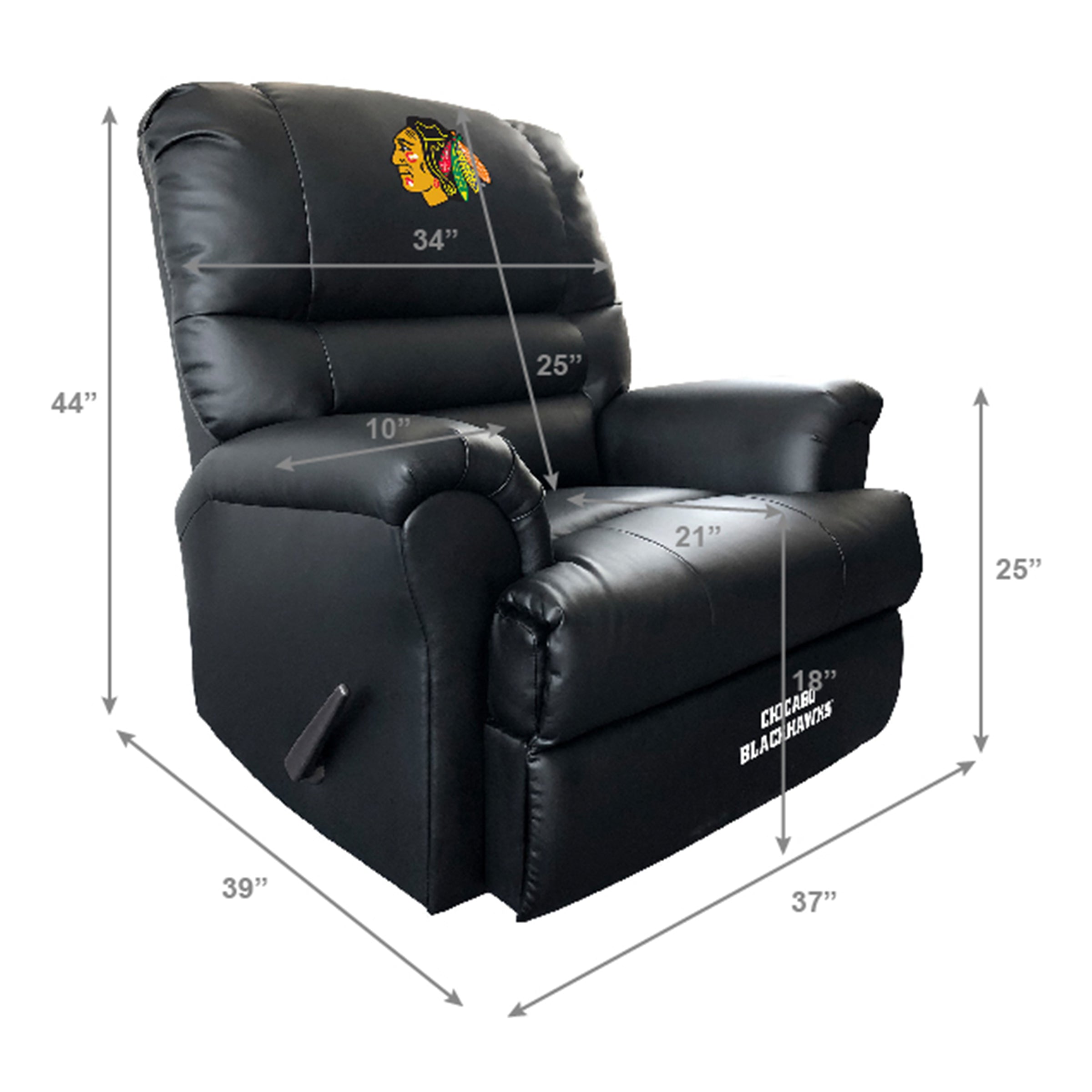 The Official Licensed NHL Chicago Blackhawks Sports Recliner is sure to be your favorite and most comfortable chair in the house! The chair is covered in premium quality faux leather (PU) with pocket coil seating. Features include an 8-inch direct embroidered logo and rocker mechanism. Carbon compliant. Assembled Dimensions: 39”H x 37”W x 44”H; 95 pounds. Imported from China. Allow 7 - 10 business days for shipping.