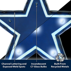 Light up your home or fancave with this DallasCowboys Logo Lighted Recycled Metal Sign. Suitable for indoor or outdoor use, this sign is built by hand from recycled metals and includes light strands with clear, incandescent C7 glass bulbs. An authentic style décor piece, the sign features channel logo and exposed weld spots that give a unique, retro look to any space. This product is officially licensed by the NFL.