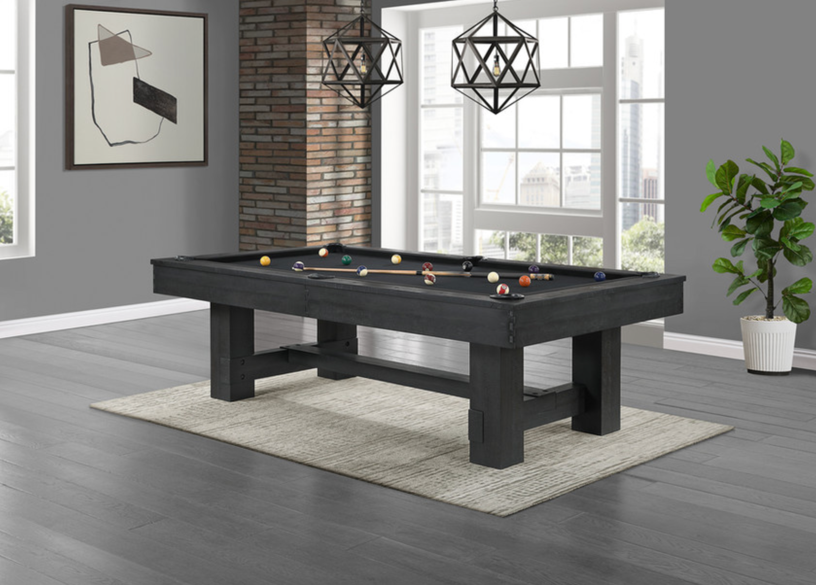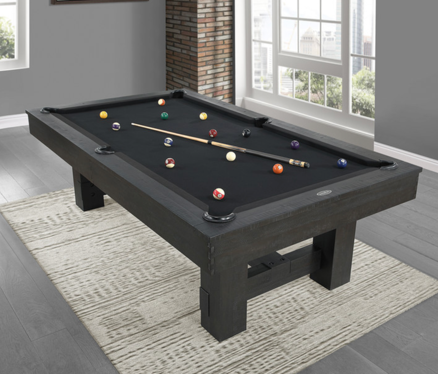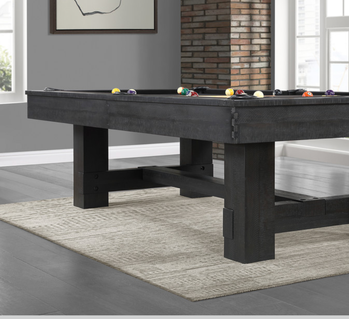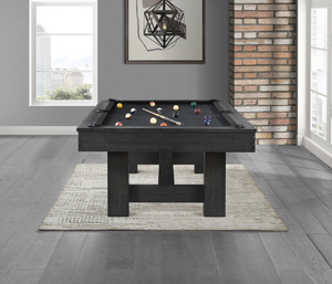 Bring bold sophistication to your game room with the 8' Reno pool table in a rich Ink Black finish. Masterfully crafted of Pine and Acacia, this table combines strength, durability, and refined craftsmanship. The clean lines and substantial leg design lend a contemporary yet rustic appeal, while the matte black stain adds a dramatic, elevated touch. Built for tournament-quality play and long-lasting performance, it’s a statement piece that delivers both function and style
