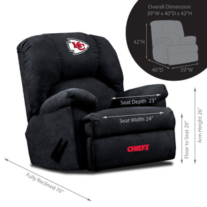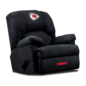 Watch the Big Game in complete comfort with the Kansas City Chiefs GM Recliner. Bring home-field advantage to any room of the house with durable, vibrant microfiber fabric decked out with an embroidered logo on the headrest and ottoman. Enjoy this rocker recliner, fit to for the fan up to 6 foot tall. A kiln-dried hardwood and cross-banded plywood frame make this chair as sturdy as it is comfortable. Product is officially licensed by the NFL and is made in the USA