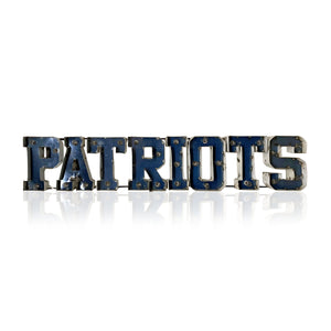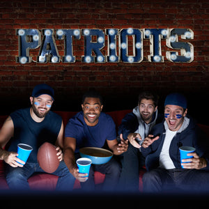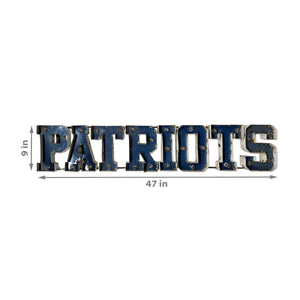 Light up your home or fancave with this New England Patriots Lighted Recycled Metal Sign. Suitable for indoor or outdoor use, this sign is built by hand from recycled metals and includes light strands with clear, incandescent C7 glass bulbs. An authentic style décor piece, the sign features channel lettering and exposed weld spots that give a unique, retro look to any space. This product is officially licensed by the NFL.