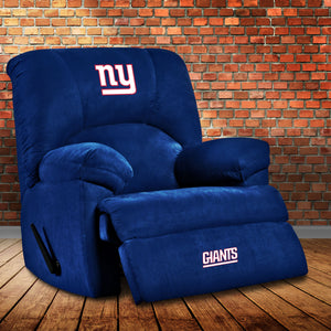 Watch the Big Game in complete comfort with the New York Giants GM Recliner. Bring home-field advantage to any room of the house with durable, vibrant microfiber fabric decked out with an embroidered logo on the headrest and ottoman. Enjoy this rocker recliner, fit to for the fan up to 6 foot tall. A kiln-dried hardwood and cross-banded plywood frame make this chair as sturdy as it is comfortable. Product is officially licensed by the NFL and is made in the USA