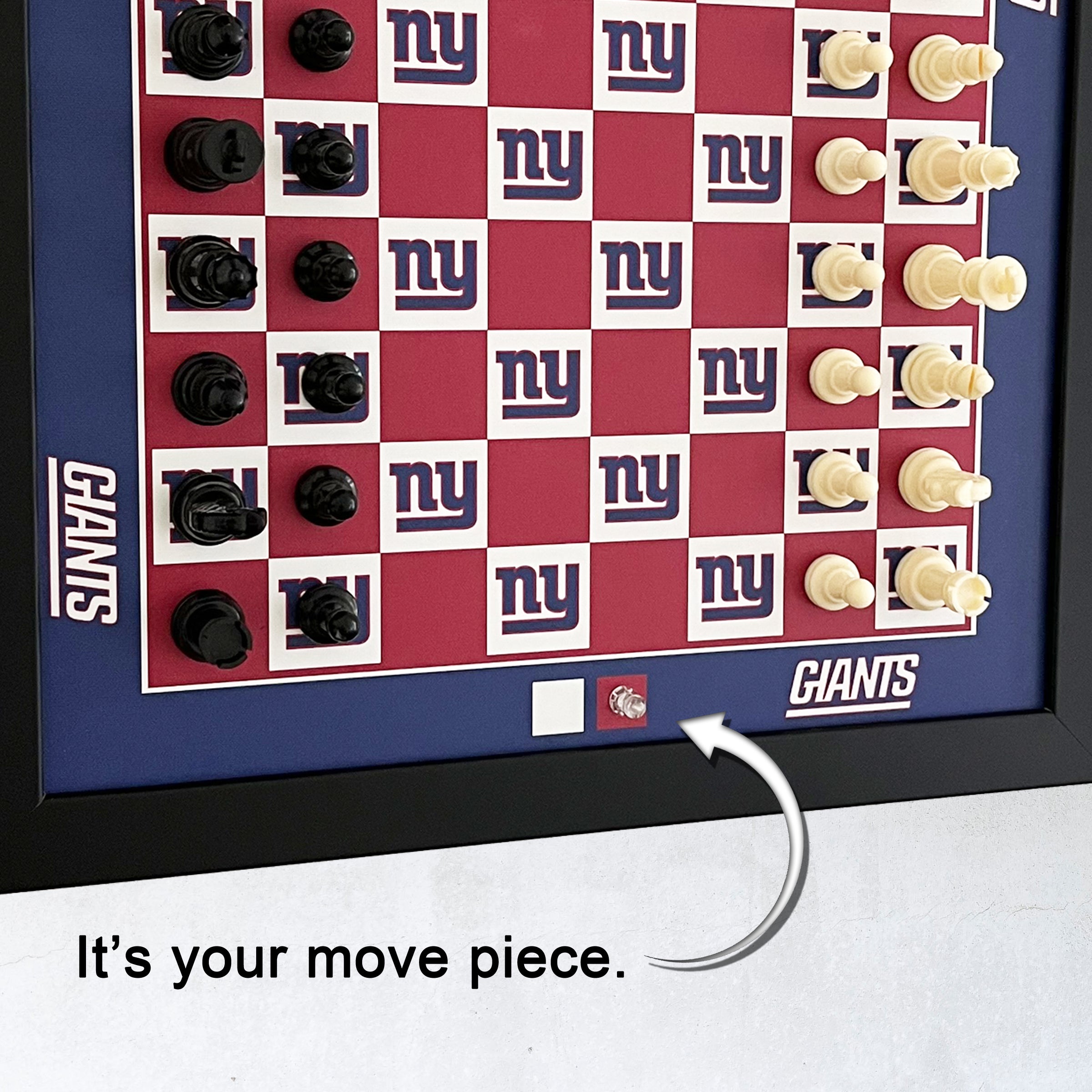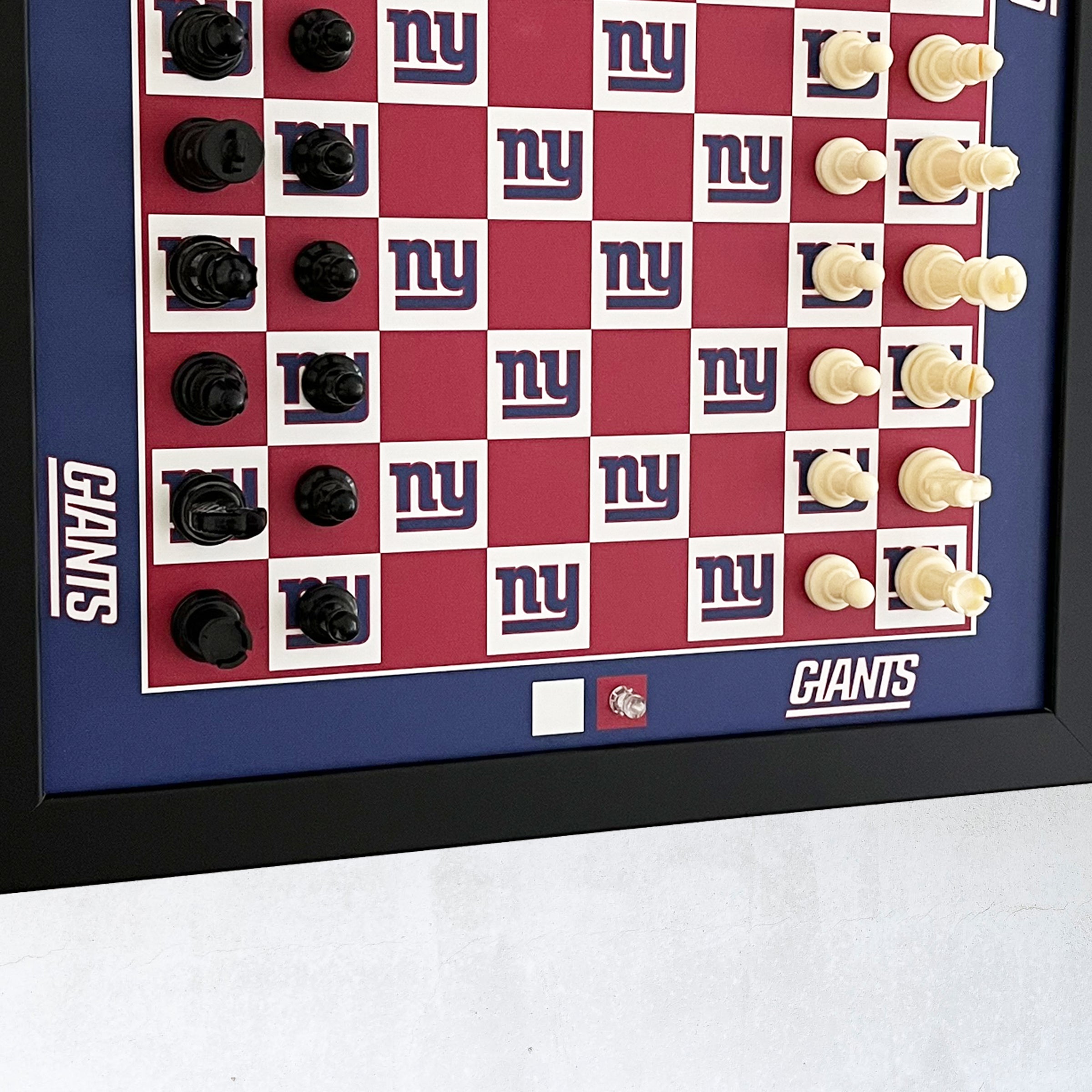 Chess, played on a vertical chess board, is a mental workout. The New York Giants board has an appealing wall aesthetic with team colors and logo design. Pieces are held in place by strong magnets. The board doubles as functional wall art or can be played on a table. Enjoy playing on your favorite team's board for years!