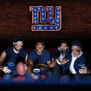 Light up your home or fancave with this NY Giants Logo Lighted Recycled Metal Sign. Suitable for indoor or outdoor use, this sign is built by hand from recycled metals and includes light strands with clear, incandescent C7 glass bulbs. An authentic style décor piece, the sign features channel logo and exposed weld spots that give a unique, retro look to any space. This product is officially licensed by the NFL.