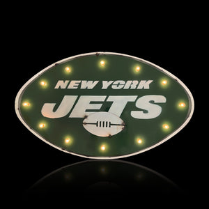 Light up your home or fancave with this NY Jets Logo Lighted Recycled Metal Sign. Suitable for indoor or outdoor use, this sign is built by hand from recycled metals and includes light strands with clear, incandescent C7 glass bulbs. An authentic style décor piece, the sign features channel logo and exposed weld spots that give a unique, retro look to any space. This product is officially licensed by the NFL.