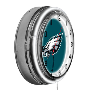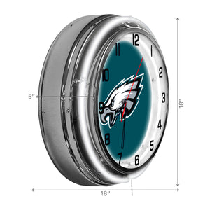 Make Your Fan Room Glow With Your 18" Philadelphia Eagles Neon Clock. Inner Band Of Neon Is White To Brighten The Face Of The Clock And Outer Band Focuses On Your Favorite Teams Color. Be The Envy Of All All Your Friends When They Come Over To Watch The Big Game
