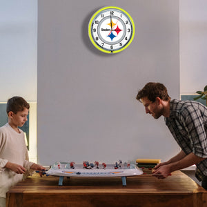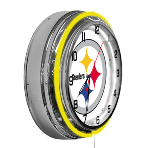 Make Your Fan Room Glow With Your 18" Pittsburgh Steelers Neon Clock. Inner Band Of Neon Is White To Brighten The Face Of The Clock And Outer Band Focuses On Your Favorite Teams Color. Be The Envy Of All All Your Friends When They Come Over To Watch The Big Game