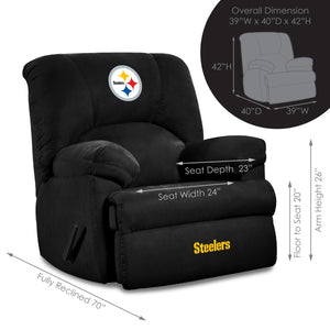 Watch the Big Game in complete comfort with the Pittsburgh Steelers GM Recliner. Bring home-field advantage to any room of the house with durable, vibrant microfiber fabric decked out with an embroidered logo on the headrest and ottoman. Enjoy this rocker recliner, fit to for the fan up to 6 foot tall. A kiln-dried hardwood and cross-banded plywood frame make this chair as sturdy as it is comfortable. Product is officially licensed by the NFL and is made in the USA