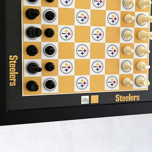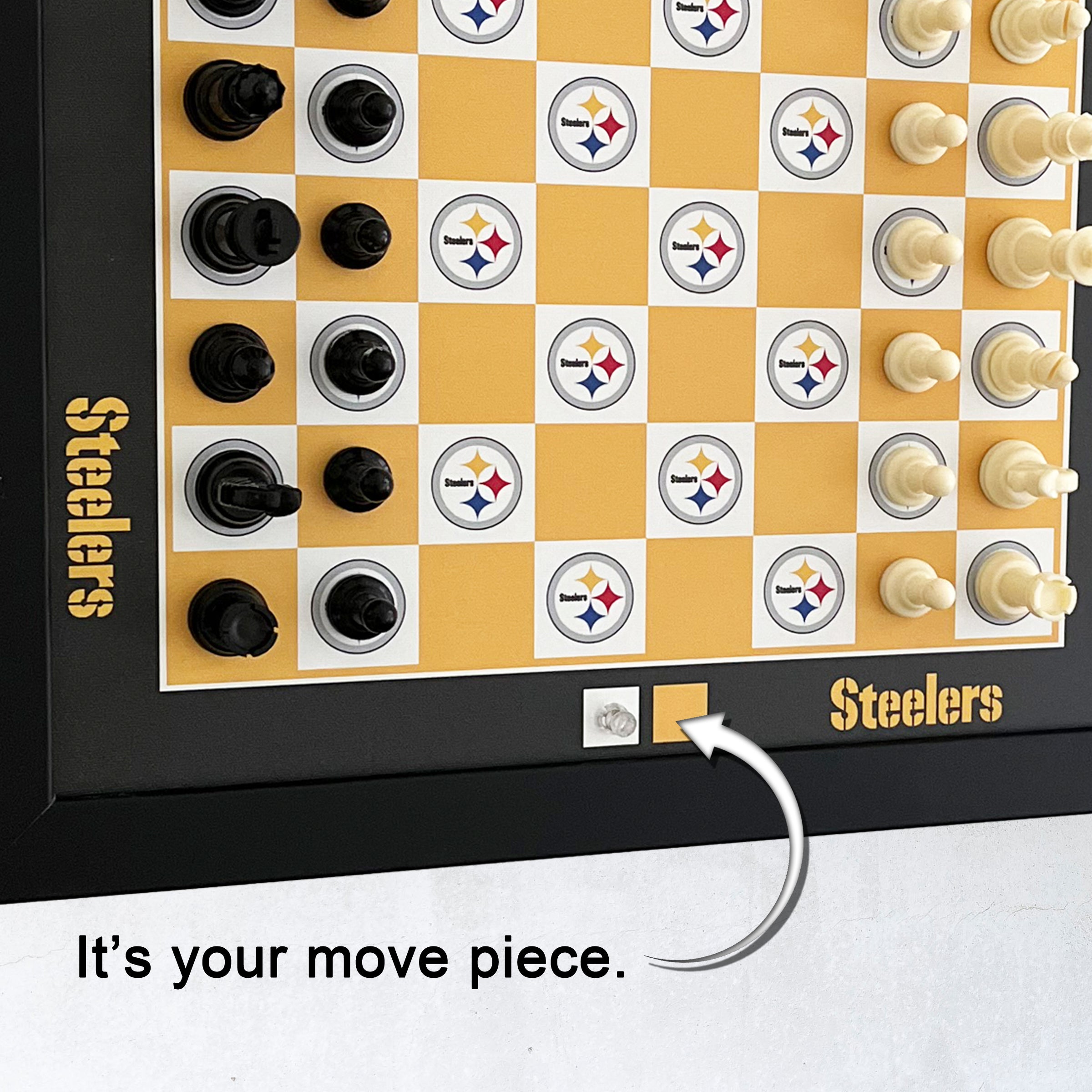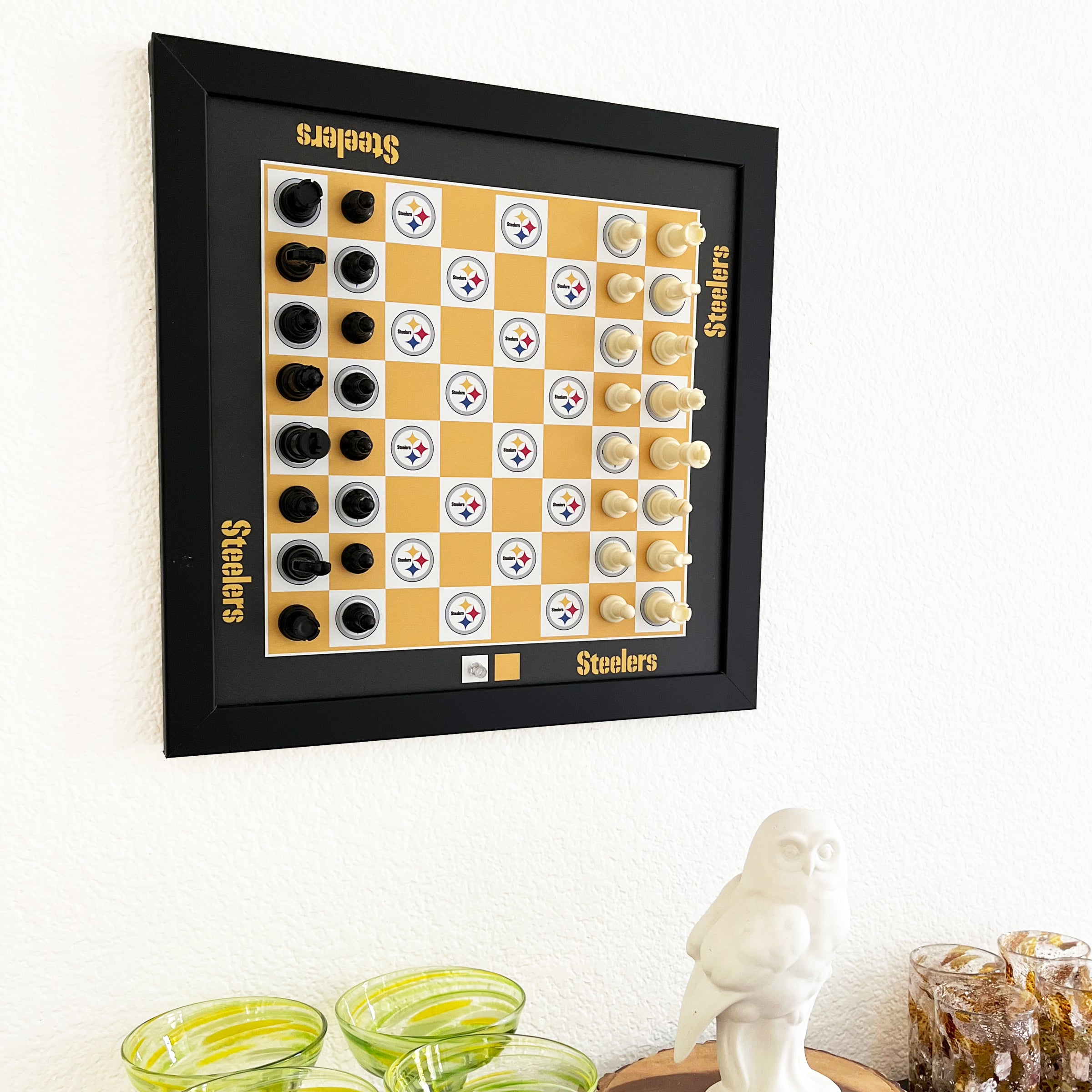Chess, played on a vertical chess board, is a mental workout. The Pittsburgh Steelers board has an appealing wall aesthetic with team colors and logo design. Pieces are held in place by strong magnets. The board doubles as functional wall art or can be played on a table. Enjoy playing on your favorite team's board for years!