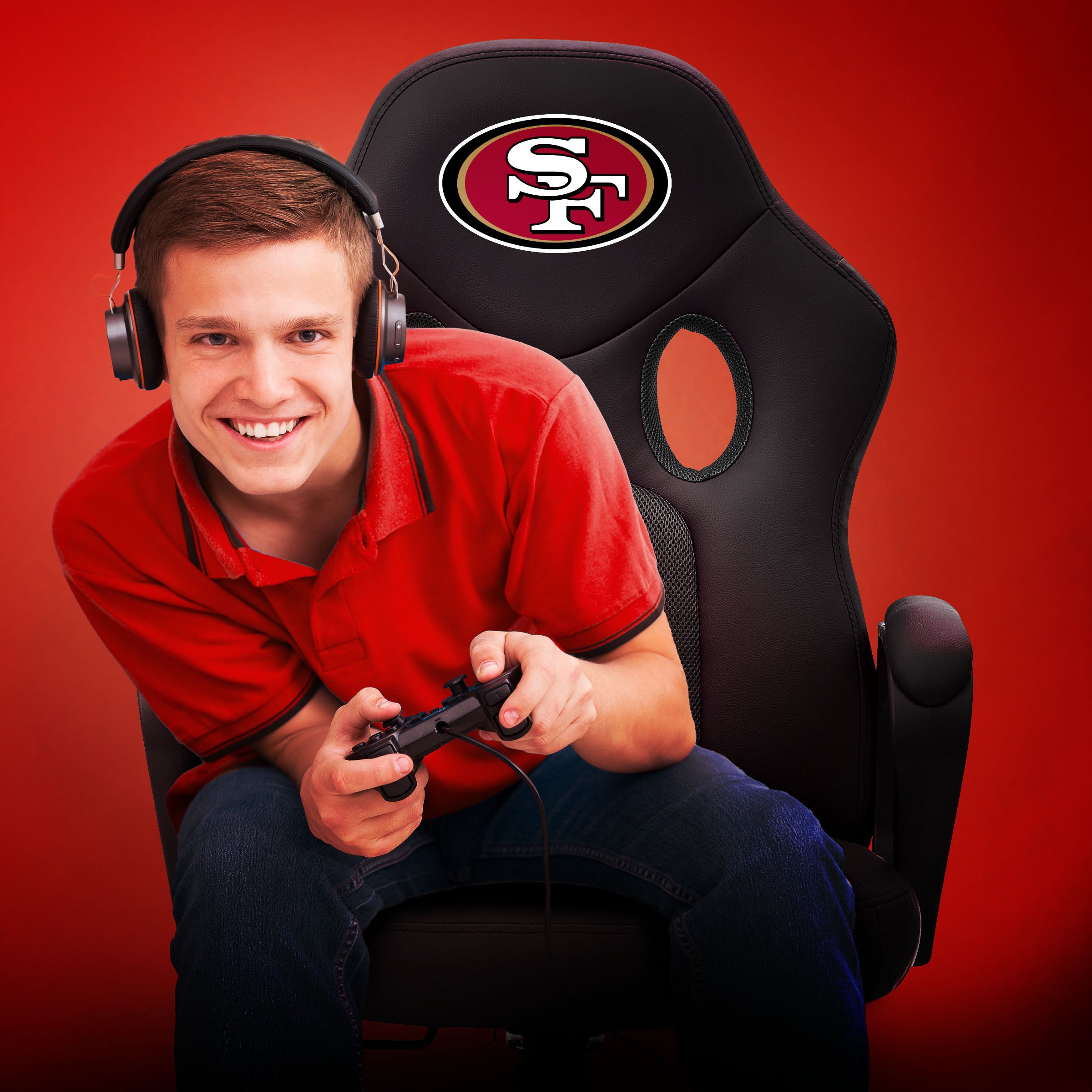 The San Francisco 49ers Vision Game Chair is a fantastic addition for any young fan! It features team color jersey-like Mesh that not only adds a sporty touch but also ensures breathability, keeping the user comfortable during long gaming sessions or study hours. Adjustable seat height feature allows users to customize the chair's height to their preference, ensuring ergonomic comfort. Tilt mechanism lets users recline slightly, providing a relaxed posture while gaming or working. 360-Degree Swivel feature provides easy rotation and allows users to move freely without getting up from the chair. The sharp modern design is sleek and contemporary, making it a stylish addition to any room.