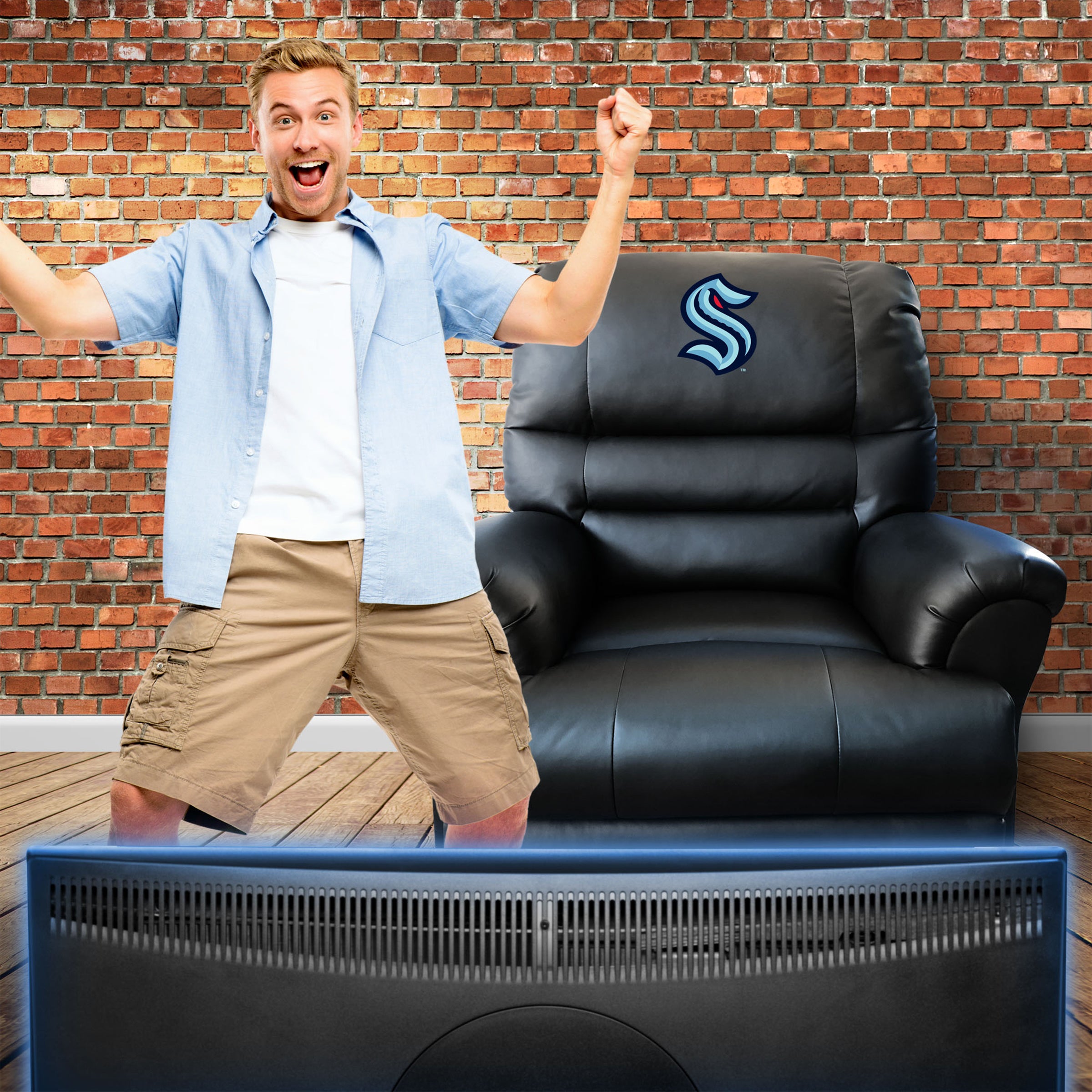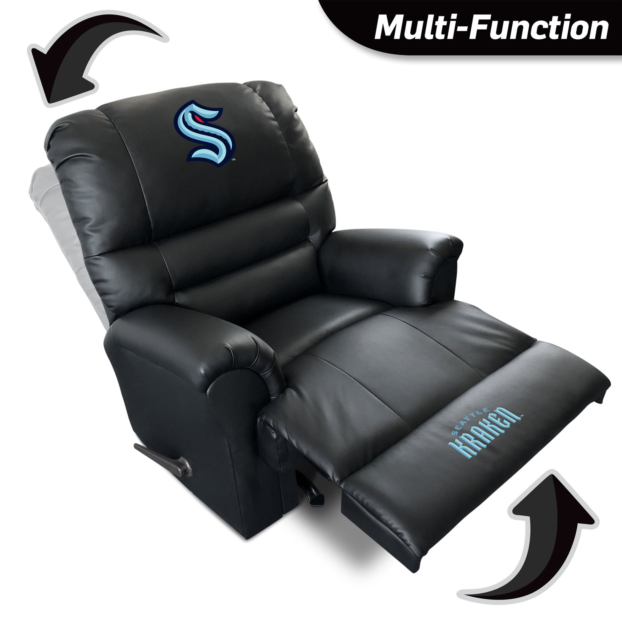 The Official Licensed NHL Seattle Kraken Sports Recliner is sure to be your favorite and most comfortable chair in the house! The chair is covered in premium quality faux leather (PU) with pocket coil seating. Features include an 8-inch direct embroidered logo and rocker mechanism. Carbon compliant. Assembled Dimensions: 39”H x 37”W x 44”H; 95 pounds. Imported from China. Allow 7 - 10 business days for shipping.