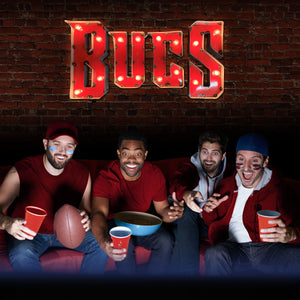 Light up your home or fancave with this Tampa Bay Buccaneers Lighted Recycled Metal Sign. Suitable for indoor or outdoor use, this sign is built by hand from recycled metals and includes light strands with clear, incandescent C7 glass bulbs. An authentic style décor piece, the sign features channel lettering and exposed weld spots that give a unique, retro look to any space. This product is officially licensed by the NFL.