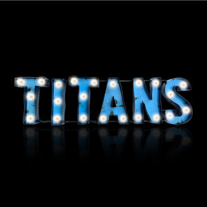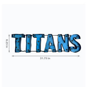 Light up your home or fancave with this Tennesse Titans Lighted Recycled Metal Sign. Suitable for indoor or outdoor use, this sign is built by hand from recycled metals and includes light strands with clear, incandescent C7 glass bulbs. An authentic style décor piece, the sign features channel lettering and exposed weld spots that give a unique, retro look to any space. This product is officially licensed by the NFL.