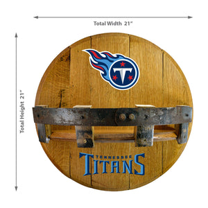 Enjoy your one of a kind Oak Kentucky Whiskey Barrel Bar Shelf. Made from authentic reclaimed oak whiskey barrel head with the original barrel ring attached and barrel stave supports and would be a nice additition to any game room or place where fans meet for the game. Matches up nicely with the Oak Barrel Clock and Side Table.